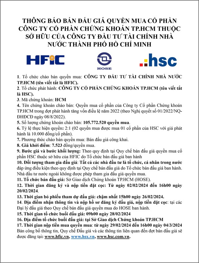 Thông báo bán đấu giá quyền mua cổ phần Công ty cổ phần Chứng khoán TP.HCM thuộc sở hữu của Công ty Đầu tư Tài chính nhà nước TP.HCM