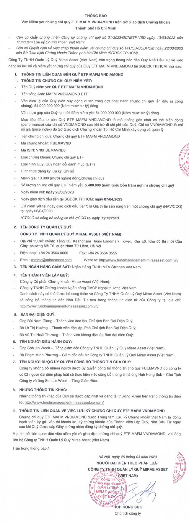 Thông báo niêm yết chứng chỉ quỹ ETF MAFM VNDIAMOND trên Sở Giao dịch Chứng khoán TP.HCM