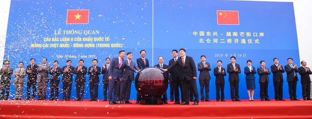 Lạnh đạo UBND tỉnh Quảng Ninh (Việt Nam) và Chính quyền Nhân dân Khu tự trị dân tộc Choang Quảng Tây (Trung Quốc) thực hiện nghi lễ thông quan cầu Bắc Luân II . Ảnh Thu Lê.