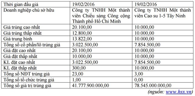 Kết quả phiên đấu giá của Công ty TNHH MTV Chiếu sáng công cộng TP. Hồ Chí Minh và Công ty TNHH MTV Cao su 1-5 Tây Ninh