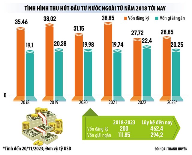 Số liệu được Cục Đầu tư nước ngoài (Bộ Kế hoạch và Đầu tư) công bố, tính lũy kế đến ngày 20/11/2023, cả nước có 38.844 dự án còn hiệu lực, với tổng vốn đăng ký 462,4 tỷ USD. Vốn thực hiện lũy kế của các dự án đầu tư nước ngoài ước đạt 294,2 tỷ USD, bằng 63,6% tổng vốn đầu tư đăng ký còn hiệu lực. Trong đó, chỉ kể từ năm 2018 đến nay, vốn đầu tư đăng ký đạt 200 tỷ USD, còn vốn giải ngân đạt 111,85 tỷ USD, tương ứng chiếm 43,25% và 38% tổng nguồn lực đầu tư nước ngoài mà Việt Nam có được trong 35 năm qua.