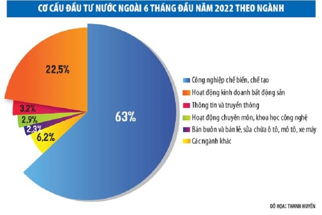 Theo Cục Đầu tư nước ngoài, tính đến ngày 20/6/2022, tổng vốn đầu tư đăng ký cấp mới, điều chỉnh và góp vốn mua cổ phần, mua phần vốn góp của nhà đầu tư nước ngoài đạt trên 14,03 tỷ USD. Tuy con số này chỉ bằng 91,1% so với cùng kỳ năm 2021 và phần nhiều do vốn đăng ký mới chưa hồi phục hoàn toàn sau sự gián đoạn của các biện pháp chống dịch năm 2021, chỉ đạt 4,94 tỷ USD, giảm 48,2% so với cùng kỳ, song vốn tăng thêm và vốn đầu tư thông qua góp vốn, mua cổ phần đều tăng rất mạnh.