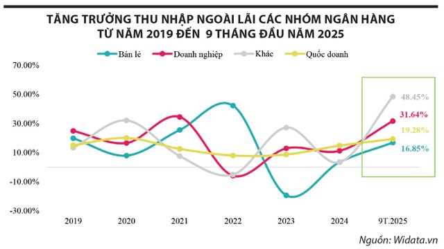 Năm 2024, sự tăng trưởng thu nhập ngoài lãi của các ngân hàng đã đồng đều trở lại, dù vẫn ở mức thấp so với các giai đoạn trước. Lũy kế 9 tháng đầu năm 2025, xu hướng đảo chiều trở nên rõ ràng hơn khi các nhóm đều quay lại tăng trưởng dương, trong đó nhóm ngân hàng khác và nhóm ngân hàng doanh nghiệp tăng lần lượt 48,45% và 31,64%, nhóm quốc doanh tăng 19,28% và nhóm bán lẻ tăng 16,85%.