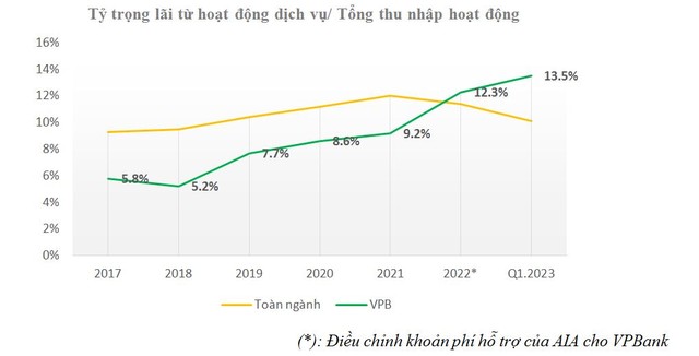 Dù vậy, dấu ấn trong thu nhập dịch vụ của VPBank trong quý 1 phải kể tới thu phí từ bảo hiểm, ghi nhận mức tăng trưởng 95% so với cùng kỳ, kể cả trong bối cảnh hoạt động bán bảo hiểm qua ngân hàng đang chịu nhiều áp lực.
