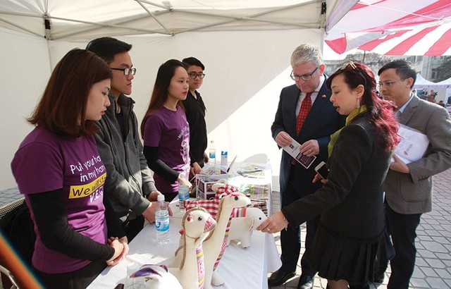Nhà đầu tư nước ngoài đang nghe các bạn trẻ giới thiệu về ý tưởng khởi nghiệp kinh doanh tại Startup Festival 2016