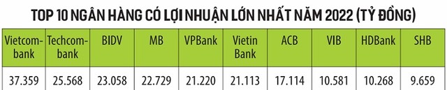 Trong 26 ngân hàng niêm yết, có tới 6 ngân hàng có lợi nhuận vượt 20.000 tỷ đồng và 9 ngân hàng có lợi nhuận vượt 10.000 tỷ đồng trong năm 2022. Có 10 ngân hàng có mức tăng trưởng lợi nhuận từ mức 40% trở lên. Ở chiều ngược lại, có 4 ngân hàng sụt giảm lợi nhuận năm qua là OCB, ABBank, KienLongBank và NCB.
