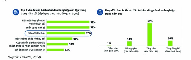 Theo một nghiên cứu được Deloitte thực hiện vào tháng 5-6/2024 với việc khảo sát hơn 2.100 giám đốc cấp cao toàn cầu của các công ty có doanh thu tối thiểu đạt 500 triệu USD/năm cho thấy, biến đổi khí hậu vẫn nằm trong Top 3 vấn đề cấp bách nhất; 85% doanh nghiệp đã gia tăng đầu tư vào bền vững thời gian qua.