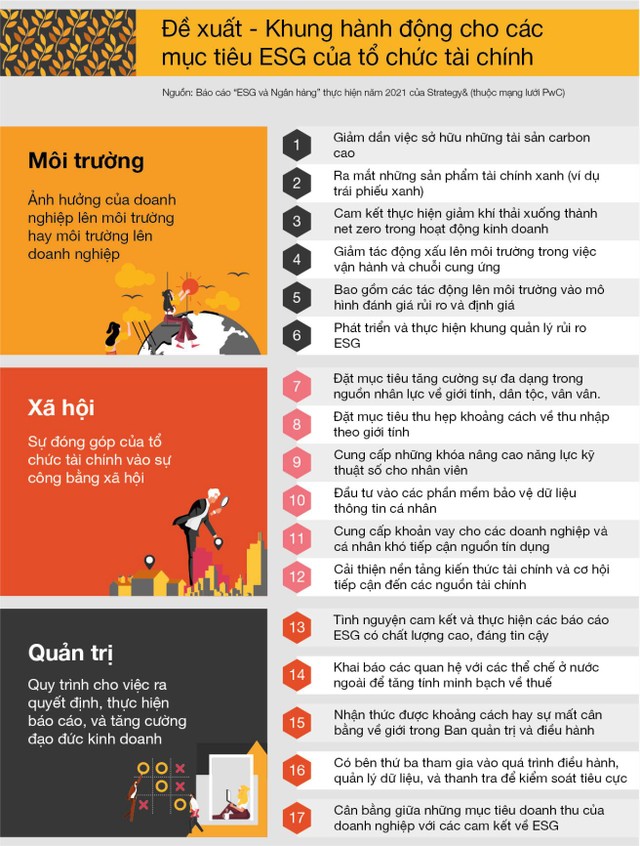 Tuy vậy, hiện nay, việc áp dụng ESG vào hoạt động kinh doanh của các ngân hàng trong nước vẫn chỉ đang ở giai đoạn đầu, với một số cải cách bước đầu trong quy trình tín dụng. Sự chuyển đổi lớn còn ở phía trước khi các ngân hàng hình thành tầm nhìn, chiến lược ESG và triển khai chiến lược này.