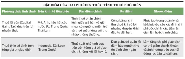 Ngược lại, một số nền kinh tế, điển hình như Indonesia hay Đài Loan (Trung Quốc), lựa chọn tính thuế theo tỷ lệ cố định trên tổng giá trị giao dịch mà không xét đến kết quả lãi hay lỗ. Cách này có ưu điểm nổi bật là đơn giản, dễ quản lý và bảo đảm nguồn thu ổn định, phù hợp với các thị trường mới nổi có năng lực giám sát hạn chế. Tuy nhiên, phương thức này có thể làm gia tăng chi phí giao dịch, ảnh hưởng đến tính thanh khoản của thị trường và giảm động lực đầu tư dài hạn. Hiện nay, có 14 quốc gia và vùng lãnh thổ đang áp dụng phương pháp thu thuế này.