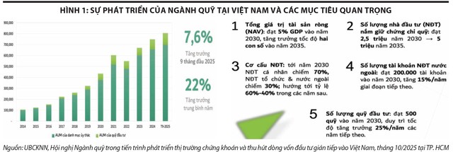 Trong thị trường vốn hiện đại, ngành quỹ giữ vai trò tập hợp vốn nhàn rỗi, phân bổ vốn theo hướng chuyên nghiệp và dài hạn, qua đó góp phần nâng cao chất lượng nhà đầu tư và giảm tác động của tâm lý ngắn hạn. Tại Việt Nam, ngành quỹ thời gian qua đã có bước phát triển rõ nét. Đến cuối tháng 9/2025, tổng giá trị tài sản quản lý (AUM) đạt khoảng 806.000 tỷ đồng, trong đó tài sản từ ủy thác danh mục khoảng 700.000 tỷ đồng (87%) và tài sản của các quỹ đầu tư chứng khoán khoảng 106.000 tỷ đồng (13%). Giai đoạn 2014 - 9/2025, tổng tài sản quản lý của các công ty quản lý quỹ tăng bình quân khoảng 22%/năm, còn giá trị tài sản ròng của các quỹ đầu tư chứng khoán tăng khoảng 31%/năm; riêng 9 tháng đầu năm 2025, hai chỉ tiêu này tăng lần lượt 7,6% và 15%.