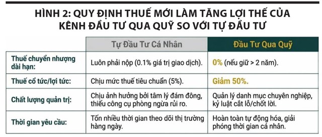 Tác động thứ ba là ưu đãi thuế giúp nâng sức cạnh tranh của kênh đầu tư qua quỹ so với tự đầu tư cá nhân. Một điểm nghẽn của thị trường Việt Nam là số lượng tài khoản cá nhân tăng nhanh, nhưng tỷ trọng dòng vốn qua các định chế quản lý tài sản chuyên nghiệp vẫn còn khiêm tốn so với nhiều thị trường phát triển. Khi chính sách thuế dành ưu đãi cho chứng chỉ quỹ nắm giữ dài hạn và lợi tức từ quỹ, Nhà nước phát đi tín hiệu rõ hơn: cần khuyến khích dòng tiền đi qua các tổ chức đầu tư chuyên nghiệp, thay vì xoay quanh giao dịch ngắn hạn của nhà đầu tư cá nhân.