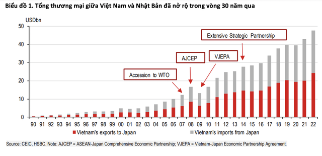 Nhận định được bộ phận Nghiên cứu Toàn cầu HSBC đưa ra trong báo cáo “Vietnam at a glance: Nhật Bản - Việt Nam - 50 năm quan hệ kinh tế” sau khi Việt Nam và Nhật Bản vừa nhất trí nâng cấp quan hệ lên “đối tác chiến lược toàn diện” mở ra nhiều cơ hội hợp tác tiềm năng giữa hai quốc gia.