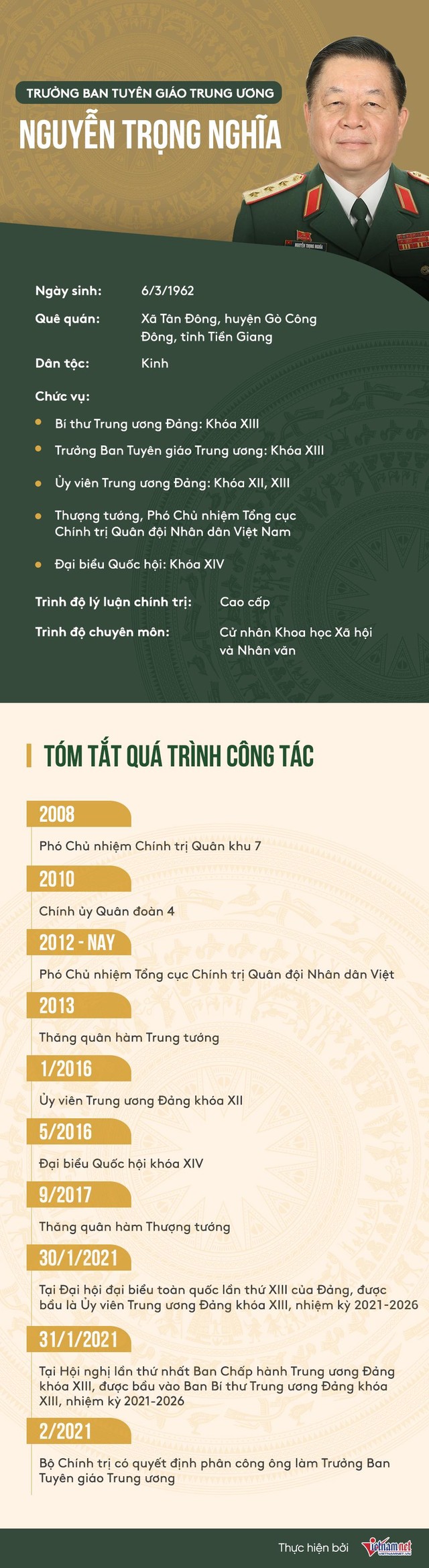 Theo Quyết định số 06, Bộ Chính trị phân công Thượng tướng Nguyễn Trọng Nghĩa, Bí thư Trung ương Đảng khóa XIII, Phó Chủ nhiệm Tổng cục Chính trị QĐND Việt Nam giữ chức Trưởng Ban Tuyên giáo Trung ương.