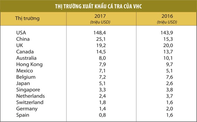 Trong khi đó, tổng doanh số hợp nhất của Vĩnh Hoàn xuất khẩu vào thị trường Mỹ năm 2017 là 148,4 triệu USD (tương đương hơn 3.300 tỷ đồng). Vĩnh Hoàn cho biết, năm 2017, vòng quay khoản phải thu của Công ty là 6,6 lần, số ngày trả tiền trung bình là 53 ngày. Như vậy, có thể gần như 100% hàng xuất qua Mỹ của hệ thống Vĩnh Hoàn đã bán qua Vĩnh Hoàn Hoa Kỳ và vòng quay khoản phải thu của khách hàng này lớn hơn mức trung bình của toàn Công ty.