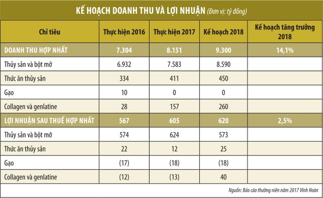 Năm 2018, Vĩnh Hoàn dự kiến kế hoạch doanh thu 9.300 tỷ đồng, tăng 14,1% so với năm 2017; lợi nhuận sau thuế cổ đông công ty mẹ 573 tỷ đồng, giảm so với kết quả thực hiện năm 2017.
