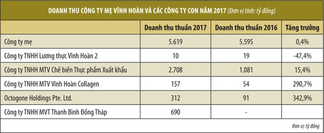 Gần đây nhất, Vĩnh Hoàn đã thoái 75% vốn tại Octogone Holding Pte. Ltd, công ty con do Vĩnh Hoàn sở hữu 100% vốn. Năm 2017 là năm công ty này tăng trưởng rất mạnh về doanh số, đạt 312 tỷ đồng, trong khi năm 2016 là 91 tỷ đồng.