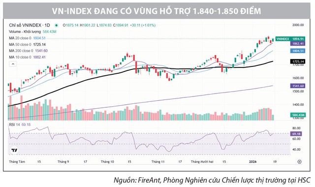Từ góc độ kỹ thuật, vùng 1.840-1.850 điểm, tương ứng với đường trung bình động MA(10), đang đóng vai trò là điểm tựa quan trọng trong ngắn hạn. Việc chỉ số nhiều lần được nâng đỡ quanh khu vực này cho thấy dòng tiền ngắn hạn vẫn sẵn sàng quay trở lại khi giá điều chỉnh. Trong khi đó, xu hướng trung - dài hạn được bảo toàn khi VN-Index duy trì vận động trên các đường MA(50) và MA(200), đồng thời cấu trúc “đáy sau cao hơn đáy trước” chưa bị phá vỡ. Chỉ báo RSI dù đã hạ nhiệt so với vùng quá mua, nhưng vẫn nằm trên ngưỡng trung tính, phản ánh trạng thái điều chỉnh mang tính lành mạnh hơn là tín hiệu đảo chiều xu hướng.