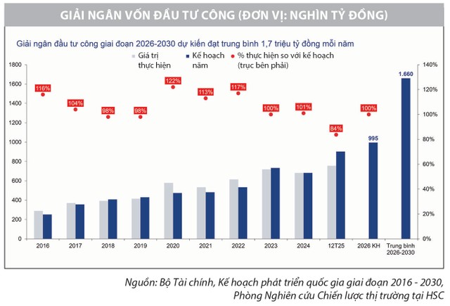Trên nền tảng đó, kế hoạch đầu tư công năm 2026 tiếp tục được mở rộng với tổng vốn ngân sách nhà nước hơn 995.000 tỷ đồng đã được Thủ tướng Chính phủ giao cho các bộ, ngành và cơ quan Trung ương. Quy mô này không chỉ tạo động lực tăng trưởng cho nền kinh tế, mà còn mở ra dư địa tăng trưởng rõ nét cho các doanh nghiệp trong chuỗi giá trị xây dựng - hạ tầng.