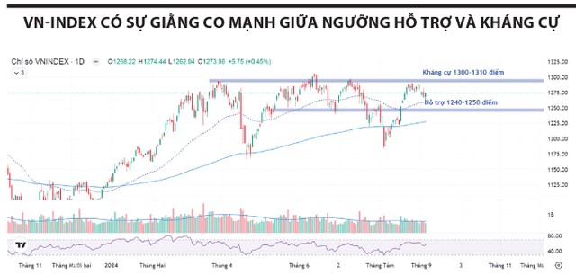 Trước đó, VN-Index có nhịp tăng khá mạnh sau khi các doanh nghiệp công bố kết quả kinh doanh bán niên 2024, tiệm cận ngưỡng 1.300 điểm nên định giá chung của thị trường, đặc biệt với các cổ phiếu phi tài chính không còn quá hấp dẫn, dù vẫn có dư địa tăng. Do đó, thị trường chung đang đi ngang, VN-Index dao động trong khoảng 1.250 - 1.300 điểm, nhằm tìm kiếm vùng cân bằng và tích lũy cho xu hướng mới.