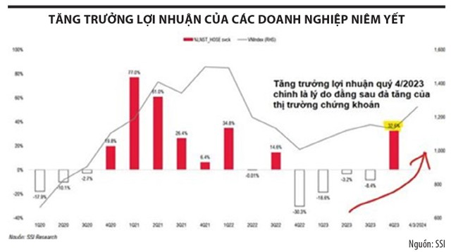 Giá cổ phiếu muốn đi lên bền vững cần xuất phát từ nội tại, chính là kết quả kinh doanh khả quan của doanh nghiệp. Kể từ quý IV/2022 đến quý III/2023, lợi nhuận của các doanh nghiệp niêm yết ghi nhận sự sụt giảm, nhưng quý IV/2023 đã tăng trở lại và triển vọng năm 2024 là tích cực. Theo đó, khi lợi nhuận doanh nghiệp tăng trưởng, nền kinh tế chính thức bước vào giai đoạn phục hồi và hỗ trợ cho đà tăng giá của thị trường chứng khoán.