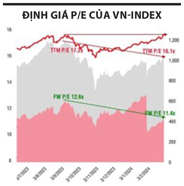 Hiện tại, VN-Index tương đương mức điểm tháng 9 - 10/2023 (1.250 điểm), nhưng P/E 12 tháng gần nhất giảm từ 17,2 lần xuống còn 16,1 lần. Trong khi đó, P/E dự báo 12 tháng tiếp theo (năm tài chính gần nhất) giảm từ 12,6 lần xuống 11,4 lần.