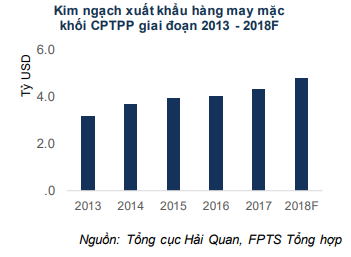 Trong giai đoạn 2013 -2017, tốc độ tăng trưởng bình quân của hàng dệt may xuất khẩu sang các nước CPTPP đạt 8%/năm. CPTPP sẽ là bàn đạp cho Việt Nam mở rộng và khai thác thị trường nội khối với kim ngạch xuất khẩu dự kiến đạt 4,8 tỷ USD năm 2018, tăng trưởng 10,5%.