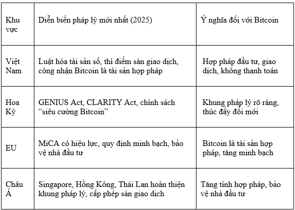 Tại Việt Nam, các hoạt động thí điểm sàn giao dịch tài sản số đang được triển khai, với Bitcoin được công nhận là tài sản hợp pháp – cho phép đầu tư và giao dịch, nhưng không dùng làm phương tiện thanh toán.