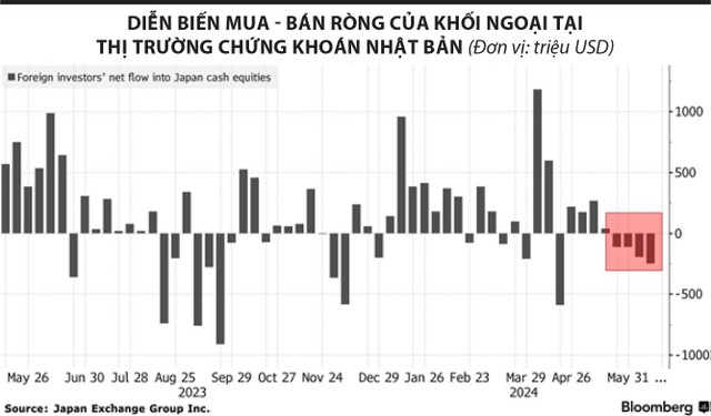 Nhà đầu tư nước ngoài, động lực chính đưa thị trường chứng khoán Nhật Bản lên mức cao kỷ lục cách đây vài tháng đã trở thành đối tượng liên tục bán ròng trong 4 tuần tính tới ngày 14/6/2024. Đây là đợt bán ròng dài nhất của khối ngoại tính từ tháng 9/2023 tới nay, theo số liệu của Sở Giao dịch chứng khoán Tokyo.