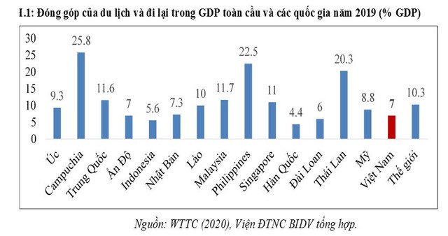 So với các nước trong khu vực về mức độ đóng góp của du lịch, năm 2019, Việt Nam đóng góp 7% GDP, nhưng Thái Lan đóng góp 20,3% GDP, Philippin đóng góp 22,5% GDP và Campuchia đóng góp 25,8% GDP.