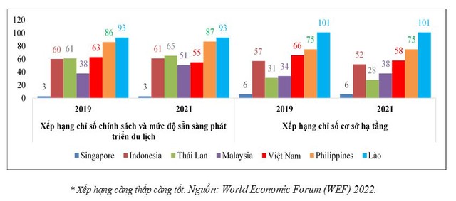 Chính sách phát triển và hạ tầng du lịch Việt Nam được đánh giá còn thua kém các nước trong khu vực, xếp hạng chỉ số chính sách và mức độ sẵn sàng phát triển du lịch của Việt Nam năm 2021 đứng thứ 55/117 quốc gia, thấp hơn Indonesia (thứ 52); Malaysia (thứ 38); Thái Lan (thứ 28) và Singapore (thứ 6).