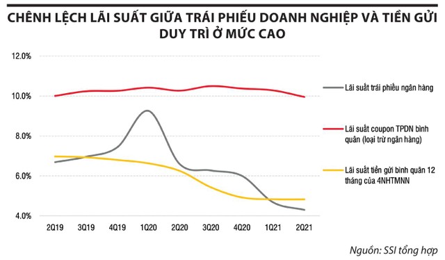 Thực tế, lãi suất tiền gửi tại ngân hàng và lãi suất trái phiếu doanh nghiệp đang “vênh” đáng kể. Mặt bằng lãi suất huy động tiền gửi bằng VND ở mức 0,1 - 0,2%/năm đối với tiền gửi không kỳ hạn và có kỳ hạn dưới 1 tháng; 2,85 - 4%/năm đối với tiền gửi có kỳ hạn từ 1 tháng trở lên; 3 - 4%/năm đối với kỳ hạn 3 tháng; 4 - 6,25%/năm đối với tiền gửi có kỳ hạn 6 tháng; 4 - 6,4% đối với tiền gửi có kỳ hạn 9 tháng; 4,7 - 6,8%/năm đối với tiền gửi có kỳ hạn 12 tháng.