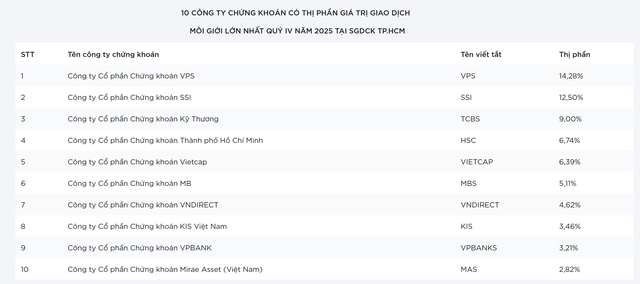 Cho cả năm 2025, VPS giữ vị trí dẫn đầu nhưng thị phần sụt giảm còn 15,95% so với mức 18,26% năm 2024.