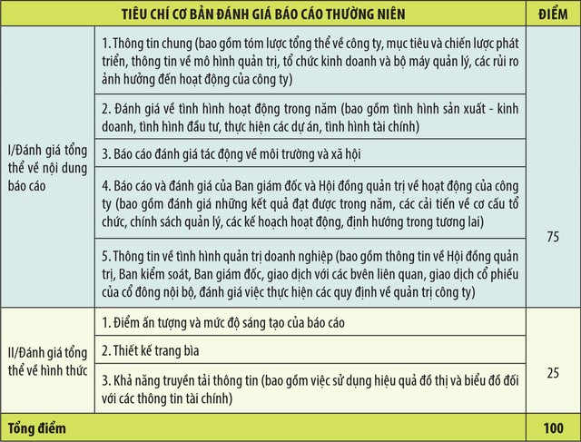 Về cơ cấu điểm, như năm trước, điểm chấm vòng sơ khảo duy trì tỷ lệ 20% và chung khảo chiếm 80% tổng điểm mỗi báo cáo. Ở vòng chung khảo, cơ cấu điểm như sau: 75 điểm cho phần đánh giá nội dung và 25 điểm cho hình thức trình bày. Trong đó, phần nội dung liên quan đến quản trị công ty chiếm cao nhất, 36 điểm; phần nội dung liên quan đến đánh giá tình hình sản xuất - kinh doanh và tài chính 33 điểm; phần liên quan đến hình thức trình bày và thông tin chung 31 điểm.