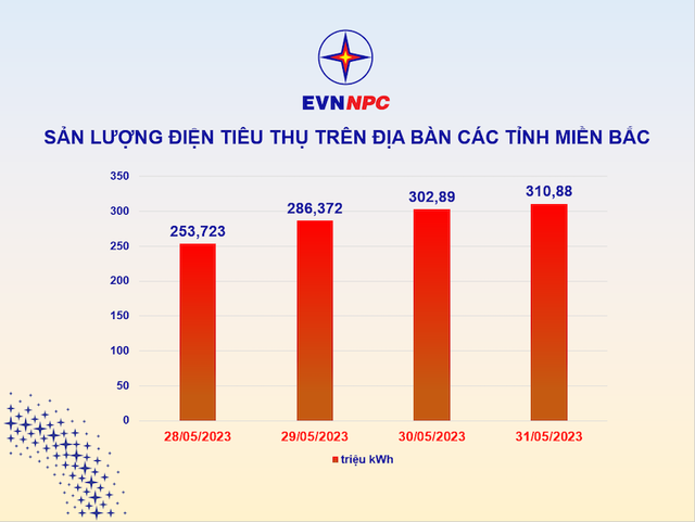 Theo số liệu từ Tập đoàn Điện lực Việt Nam (EVN), sản lượng điện tiêu thụ của miền Bắc trong hai ngày vừa qua tiếp tục tăng mạnh trở lại, cụ thể ngày 30-31/5/2023 lần lượt đạt 302,89 triệu kWh và 310,88 triệu kWh, với nắng nóng gay gắt vẫn tiếp tục, sản lượng điện tiêu thụ dự báo sẽ còn tăng cao hơn rất nhiều.