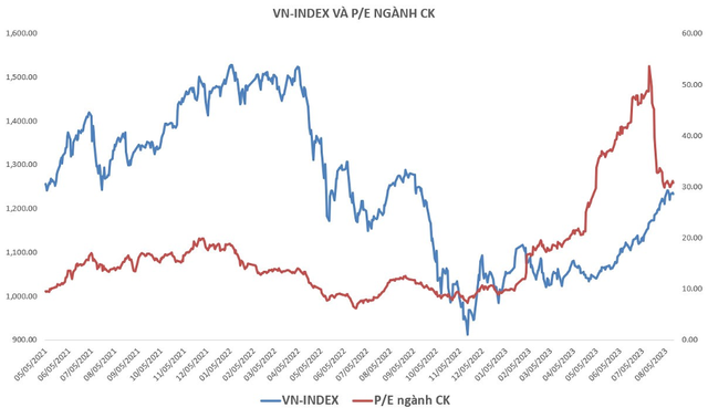 Tuy nhiên, nếu dùng chỉ số PE để xem xét động lực tăng trưởng thì sẽ có một bức tranh hoàn toàn khác hẳn. PE của ngành chứng khoán trong giai đoạn VN-Index 1.500 điểm là khoảng 15, thì hiện này, con số này là gấp 2 (gần 30), mặc dù VN-Index hiện nay đang ở mốc 1.190 điểm. Đây là lý do khiến cho nhiều nhà đầu tư “chùng tay” và kỳ vọng giá cổ phiếu sẽ được điều chỉnh ở mức hợp lý hơn. Do vậy, vẫn có thể tìm cơ hội ở cổ phiếu chứng khoán nhưng nhà đầu tư cũng cần tỉnh táo trong mỗi con sóng để có hành động giao dịch thích hợp.