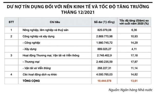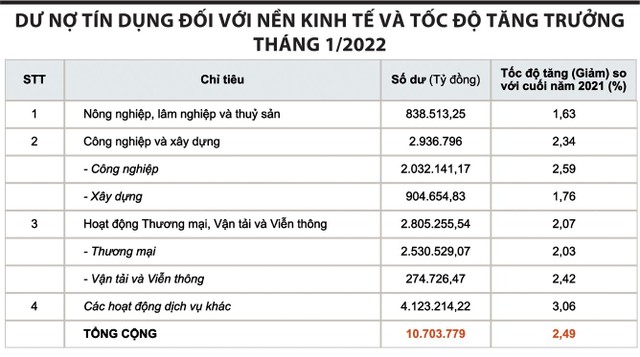 Số liệu của Ngân hàng Nhà nước cho thấy, tính đến hết tháng 1/2022, trong 10,7 triệu tỷ đồng dư nợ tín dụng đối với nền kinh tế, dư nợ trong lĩnh vực công nghiệp và xây dựng tăng 2,34%, đạt 2,9 triệu tỷ đồng. Trong khi đó, lĩnh vực nông lâm thủy sản đạt 838.000 tỷ đồng, tăng 1,63% - mức tăng trưởng thấp nhất trong các lĩnh vực được Ngân hàng Nhà nước thống kê.