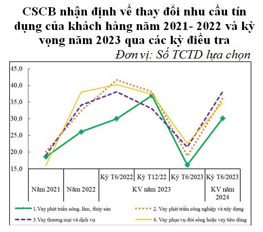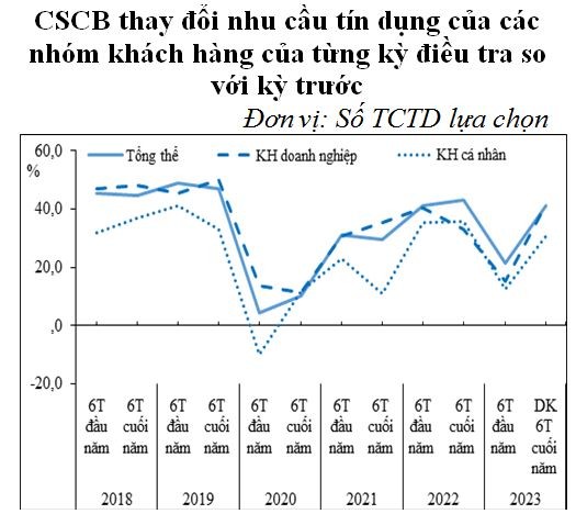 Tương tự năm 2021-2022, trong nửa đầu năm 2023 và cả năm 2023, diễn biến tăng trưởng kinh tế; diễn biến lãi suất; thay đổi lãi suất cho vay của TCTD; thay đổi nhu cầu đầu tư vào sản xuất kinh doanh, tiêu dùng của khách hàng; chất lượng phục vụ cải thiện là những nhân tố được nhiều TCTD nhận định ảnh hưởng tích cực đến sự gia tăng nhu cầu tín dụng của nhóm khách hàng doanh nghiệp.