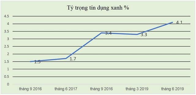 Với các nỗ lực chung, đến nay nền tảng pháp lý, thể chế, chính sách cho ngân hàng-tín dụng xanh về cơ bản đã hình thành. Dư nợ tín dụng xanh qua thống kê chưa đầy đủ đến tháng 6/2019 đã tăng rất nhanh lên đến 317.600 tỷ đồng. Tỷ trọng tín dụng xanh cũng tăng mạnh từ 1,5% lên 4,1% tổng dư nợ toàn nền kinh tế (xem đồ thị minh họa).