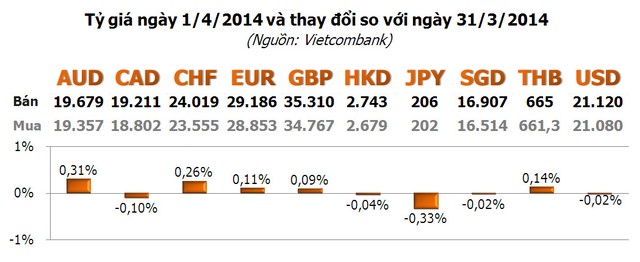 Với các ngoại tệ khác, phần lớn không thay đổi đáng kể. JPY giảm mạnh nhất với –0,33%; trong khi AUD tăng mạnh nhất với 0,36%.