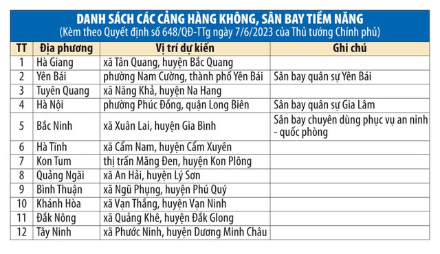 Lãnh đạo Bộ Xây dựng cho biết, Quy hoạch hệ thống cảng hàng không được Thủ tướng Chính phủ phê duyệt tại Quyết định số 648/QĐ-TTg ngày 7/6/2023 đã xác định 12 vị trí cảng hàng không tiềm năng. Đây là các vị trí đã được nghiên cứu, đánh giá sơ bộ các yếu tố kỹ thuật để hình thành cảng hàng không.