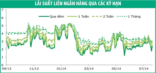 Trong tuần từ 28/7 - 1/8, lãi suất liên ngân hàng có sự điều chỉnh, giảm trong những ngày cuối tháng và tăng trong những ngày đầu tháng. Nguyên nhân chủ yếu do hầu hết các ngân hàng đều đã đạt mức dự trữ bắt buộc. Lãi suất liên ngân hàng ngày 30/7 đạt mức thấp kỷ lục kể từ giữa tháng 6: qua đêm (1,8%/năm), 1 tuần (2,4%/năm), 2 tuần (2,7%/năm) và 1 tháng (3,0%/năm). Sang ngày 31/7, lãi suất kỳ hạn qua đêm tăng mạnh khoảng 0,3 điểm phần trăm, lên 2,1%/năm do nhu cầu thanh toán 8.000 tỷ đồng trái phiếu chính phủ trúng thầu ngày 29/7 đến hạn thanh toán. Ngày 1/8, nhu cầu mua VND để thanh toán và duy trì dự trữ bắt buộc tăng trở lại nên lãi suất VND ngắn hạn tăng nhẹ: qua đêm (2,4%/năm), 1 tuần (3,0%/năm), 2 tuần (3,0%/năm), 1 tháng (3,1%/năm).
