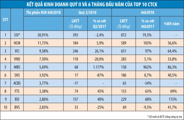 Nhờ sự tích cực của quý I/2018 mà tính chung 6 tháng, tỷ lệ hoàn thành kế hoạch lợi nhuận tại một số công ty chứng khoán như VCI, MBS, HSC, FPTS đã lên đến trên 50%. Cá biệt BSI đã hoàn thành kế hoạch chỉ sau nửa đầu năm.