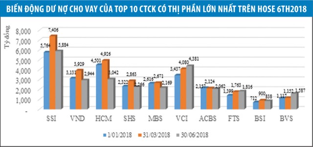 Ghi nhận mức giảm mạnh nhất là HSC khi dư nợ đến 30/6/2018 chỉ còn 3.042 tỷ đồng, giảm 38% so với cuối quý I và giảm 34% so với đầu năm.