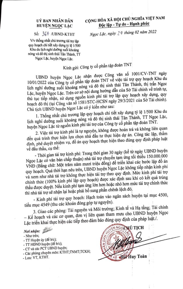 Trước đó, ngày 10/01/2022, Công ty cổ phần Tập đoàn TNT có công văn số 1001/CV-TNT gửi UBND huyện Ngọc Lặc về việc đề xuất tài trợ kinh phí lập quy hoạch chi tiết 1/500 xây dựng Khu du lịch nghỉ dưỡng suối khoáng nóng và đô thị sinh thái Tân Thành với quy mô 102,41ha. Trong văn bản, tập đoàn TNT cho biết đã tìm hiểu kỹ lưỡng về huyện Ngọc Lặc, về các chủ trương phát triển kinh tế - xã hội của địa phương, cũng như đã thực hiện nhiều chuyến khảo sát thực tế trong phạm vi huyện.