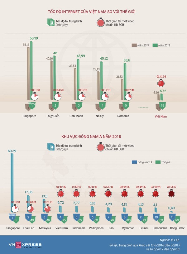 Việt Nam tụt một bậc trên bảng xếp hạng toàn cầu về tốc độ Internet và kém xa nước cùng láng giềng là Singapore.