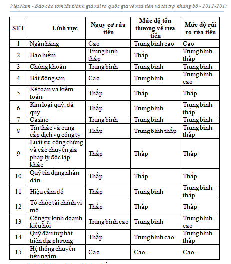 “Trên cơ sở phân tích những nội dung nêu trên, có thể kết luận nguy cơ rửa tiền đối với loại tội phạm này là cao”, Báo cáo kết quả đánh giá rủi ro quốc gia về rửa tiền, tài trợ khủng bố giai đoạn 2012-2017 nhấn mạnh.