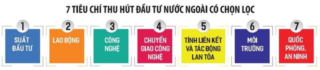 Từ thực tế trên, Bộ Kế hoạch và Đầu tư đã đề xuất 7 tiêu chí thu hút FDI có chọn lọc. Hầu hết các tiêu chí đã được thể chế hóa trong các chính sách pháp luật của nhà nước và giờ được xếp chung “một rổ”, để trở thành bộ lọc các dự án FDI cho Việt Nam.