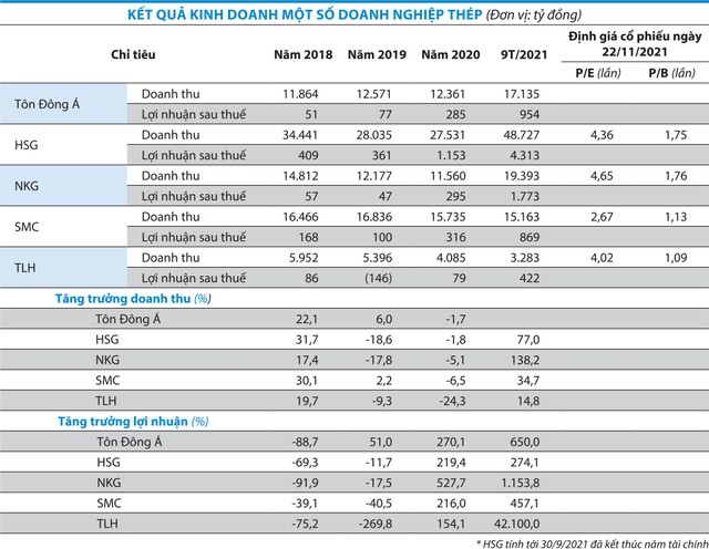 Tuy nhiên, kể từ khi ra báo cáo phân tích về Tôn Đông Á, giá thép thế giới đảo chiều và nhóm cổ phiếu thép trên sàn chứng khoán có diễn biến giảm. Nhờ 2 phiên gần nhất tăng giá trở lại nên tính đến cuối tuần qua (26/11/2021), mức giảm so với đỉnh gần nhất khoảng 1 tháng trước được thu hẹp từ trên 20% xuống còn 10 - 20%, định giá P/E của cổ phiếu HSG, NKG, SMC, TLH lần lượt là 4,4 lần, 4,5 lần, 2,7 lần, 4,5 lần.