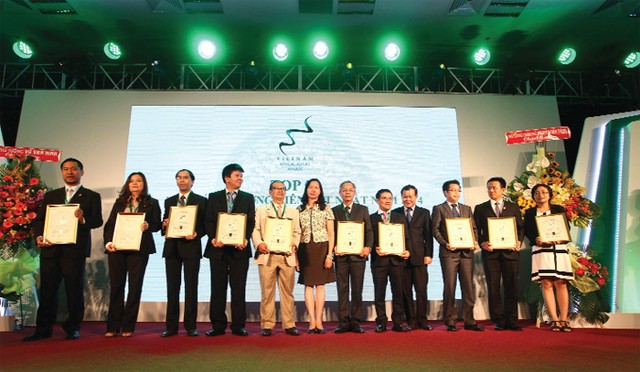Ông Trần Đắc Sinh, Chủ tịch HOSE và bà Nguyễn Thị Liên Hoa, Phó Chủ tịch UBCK trao giải cho DN có BCTN được bình chọn trong Top 10 BCTN tốt nhất năm 2014