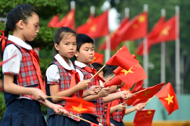Đông đảo các cháu thiếu nhi nồng nhiệt chào đón Tổng Bí thư, Chủ tịch Trung Quốc Tập Cận Bình và Đoàn đại biểu cấp cao Đảng, Nhà nước Trung Quốc. Ảnh: VGP/Nhật Bắc